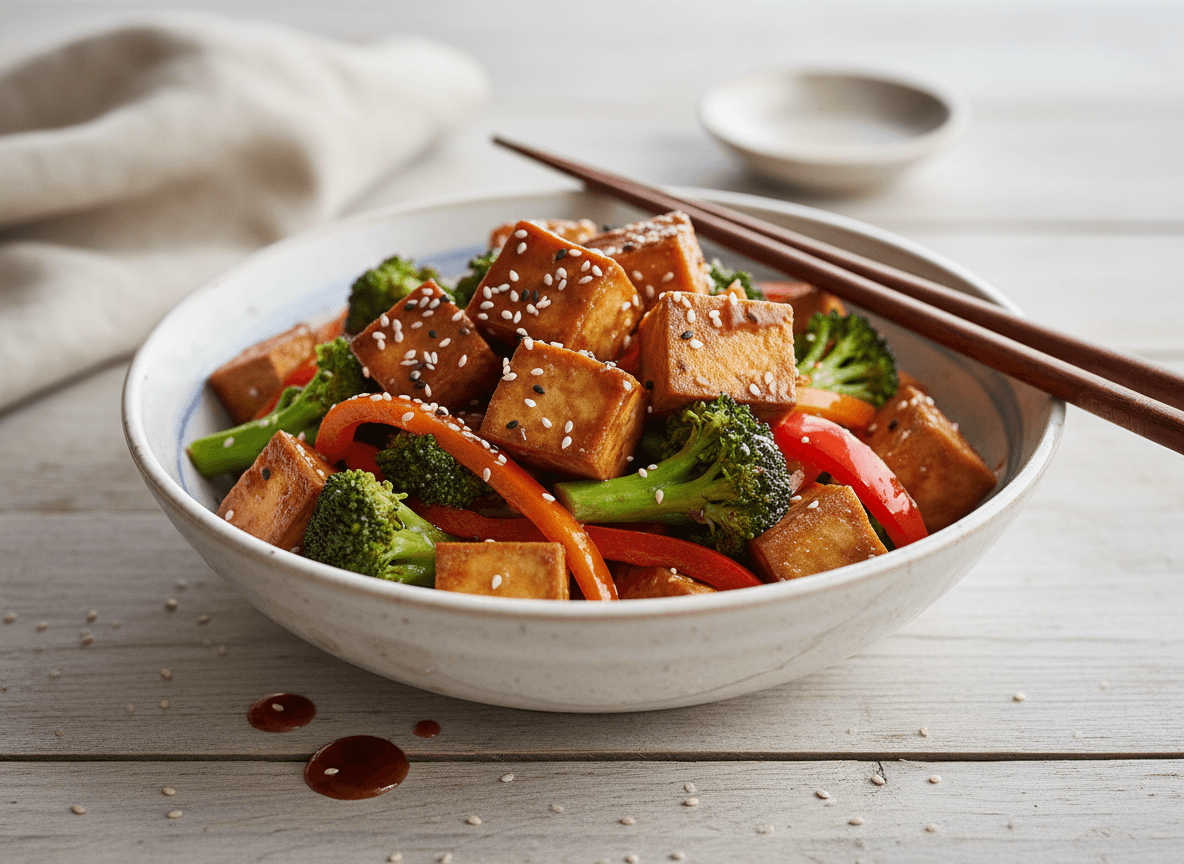 Crispy pan-fried tofu tossed with vibrant stir-fried vegetables and a savory sesame-ginger sauce. A quick, flavorful, and satisfying vegan dinner that's perfect for any night of the week.