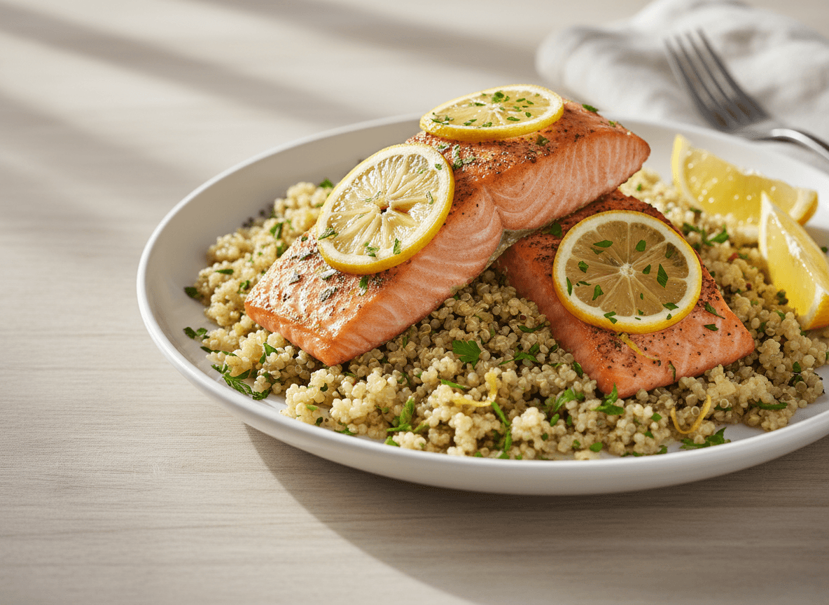 Enjoy a light and nutritious meal with this Baked Salmon with Lemon Herb Quinoa. Perfectly flaky salmon is baked alongside fluffy quinoa, infused with fresh lemon zest, parsley, and a drizzle of olive oil for a vibrant and healthy dish.