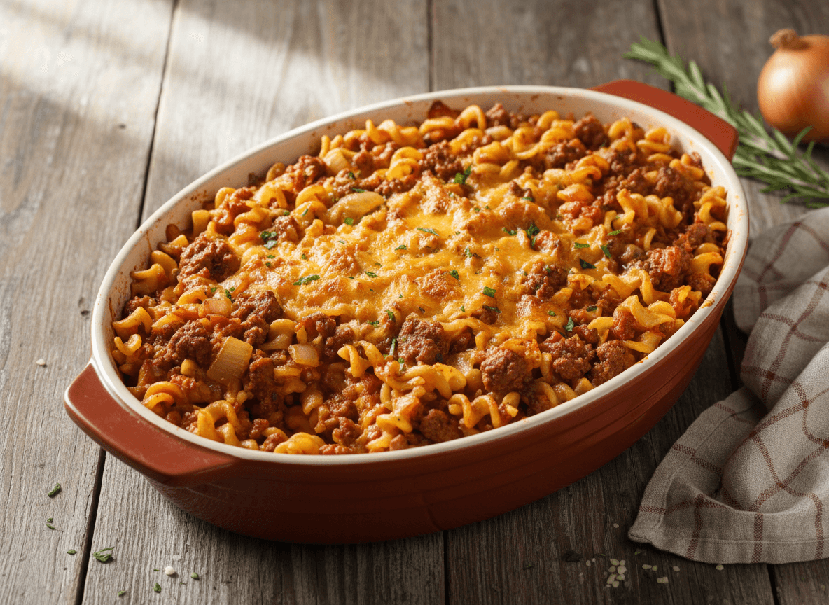 A timeless, comforting casserole featuring savory ground beef, tender noodles, and a rich, creamy cheese sauce. This easy, filling dish is perfect for cozy weeknight dinners and brings a taste of nostalgia to your table.