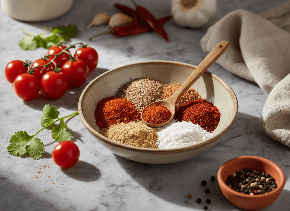 Gather all your spices: chili powder, cumin, paprika, garlic powder, onion powder, dried oregano, salt, black pepper, and cayenne pepper (if using).